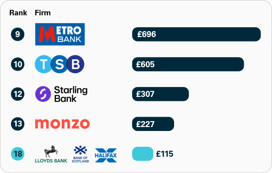 APP fraud received per £million transactions: major UK banks and building societies. This data shows the amount of APP fraud received per million pounds of transactions, ranked out of 20 firms. Lower figure is better.