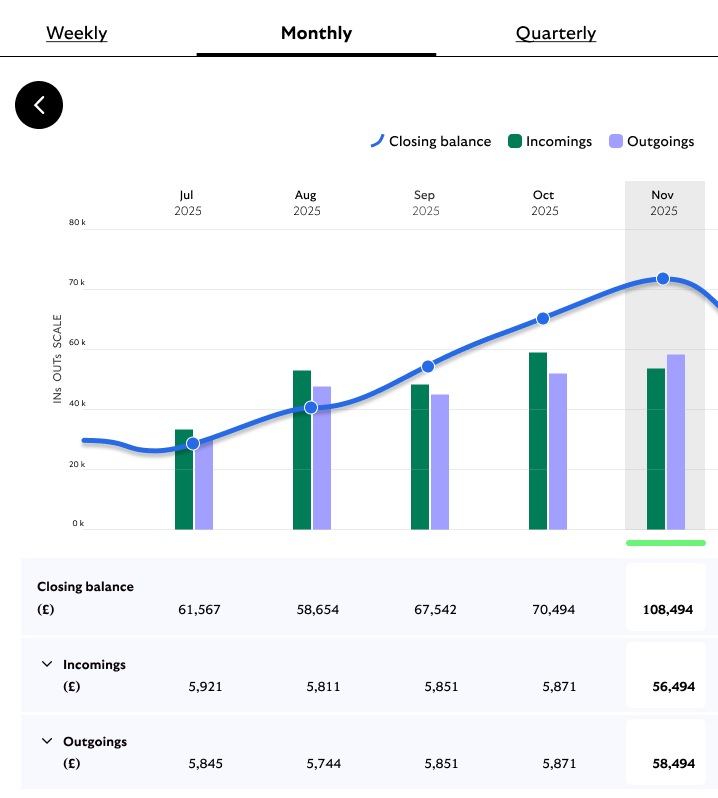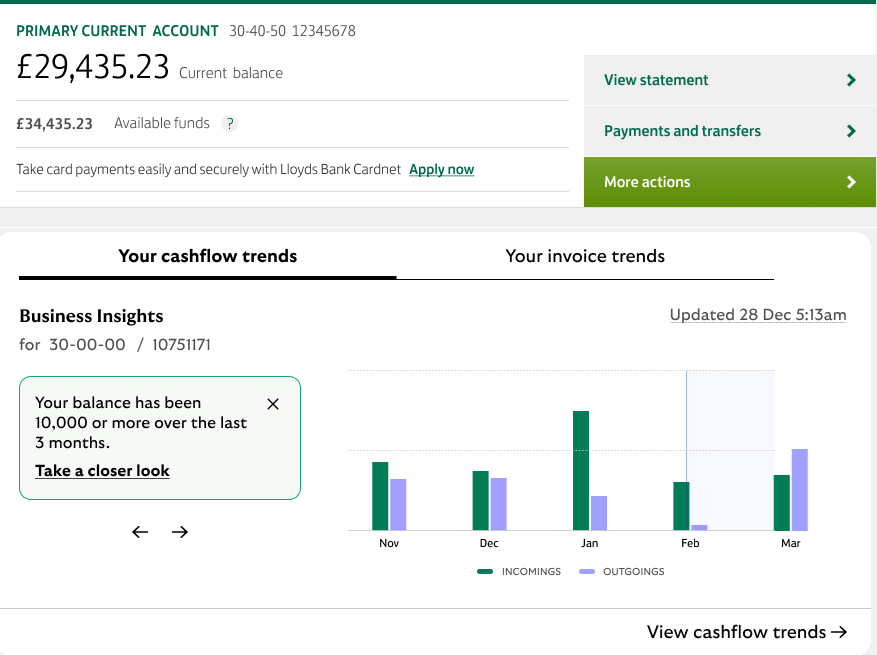 Business Insights analyses your Business Current Account activity. This data is transformed into insights, creating a clear picture of your cash flow: a deep dive into your incomings, outgoings, balance and other trends that provide a fuller understanding of your business and finances.